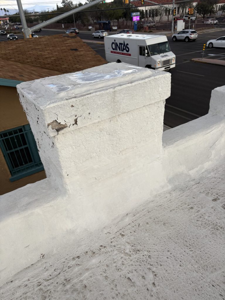 I think the best bet will be to just screw the mount that comes with the kit into this chimney, the highest point around the edge of the roof.
